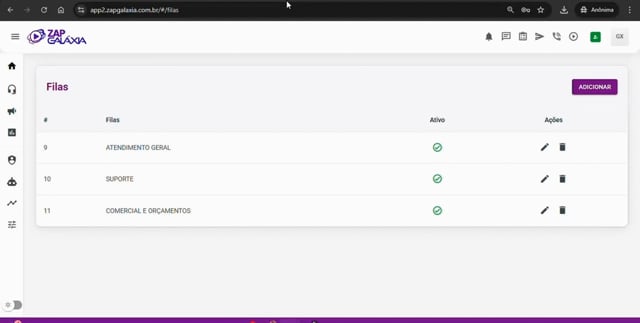 Vincule à Fila: Após conectar, clique no ícone de editar (canetinha) no canal criado. Em Fila, selecione para onde as mensagens desse número devem ir (ex: Atendimento Geral).