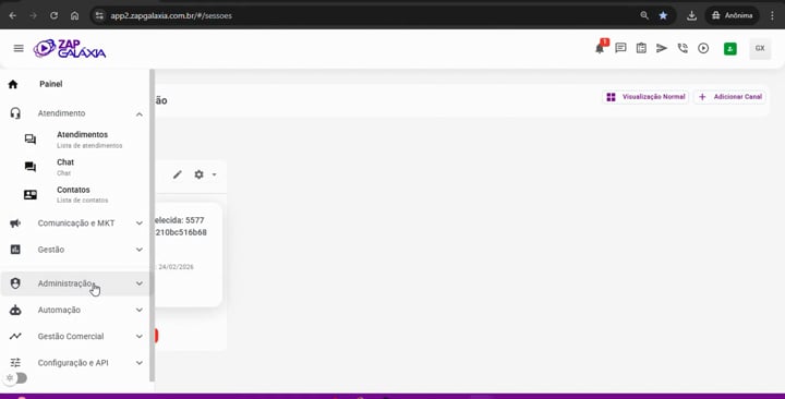 Acesse o Menu: No painel lateral esquerdo, clique em Administração e depois em Canais.